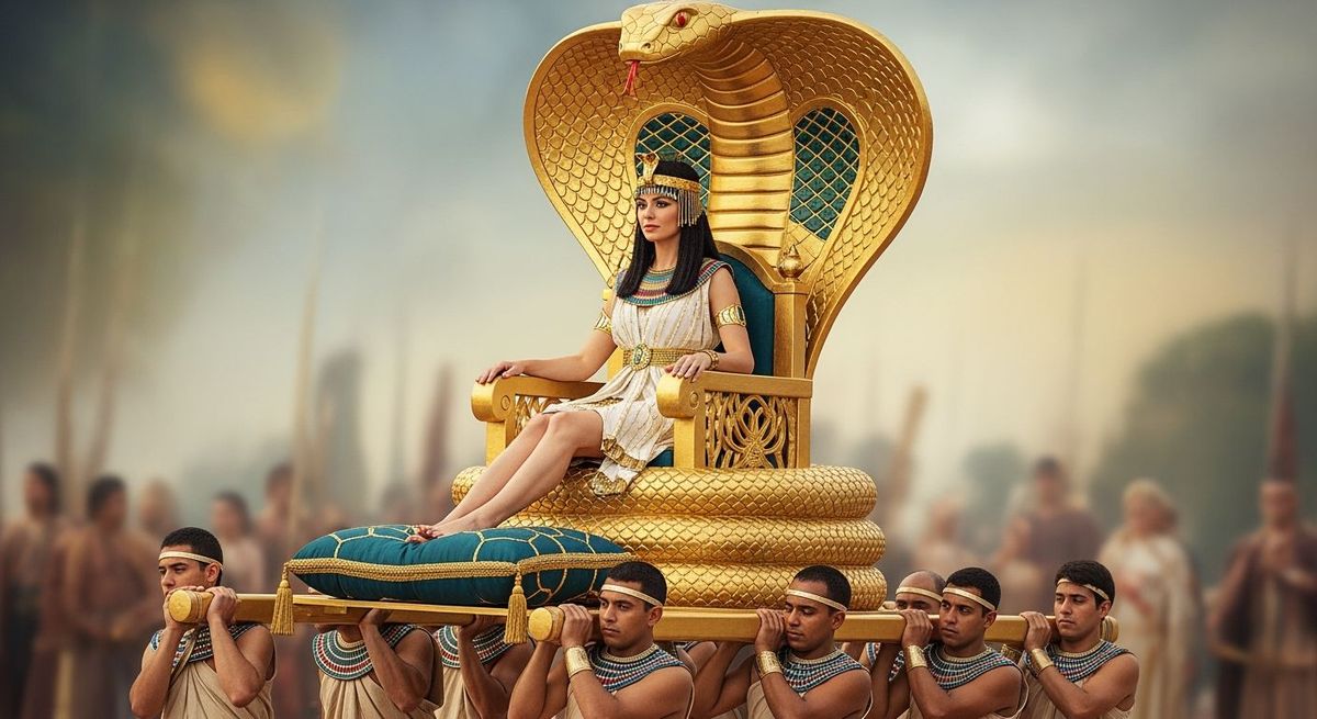 This image shows an Egyptian queen being carried on a throne. She is in a gold and emerald toga, and the throne is shaped like a cobra. The image evokes a National Geographic style with vibrant colors.