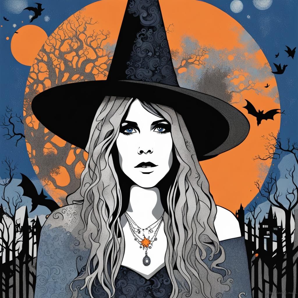 A striking image of a witch in blue and orange, reminiscent of Stevie Nicks. The artwork features a whimsical comic book style with dramatic lighting and a detailed fantasy background.