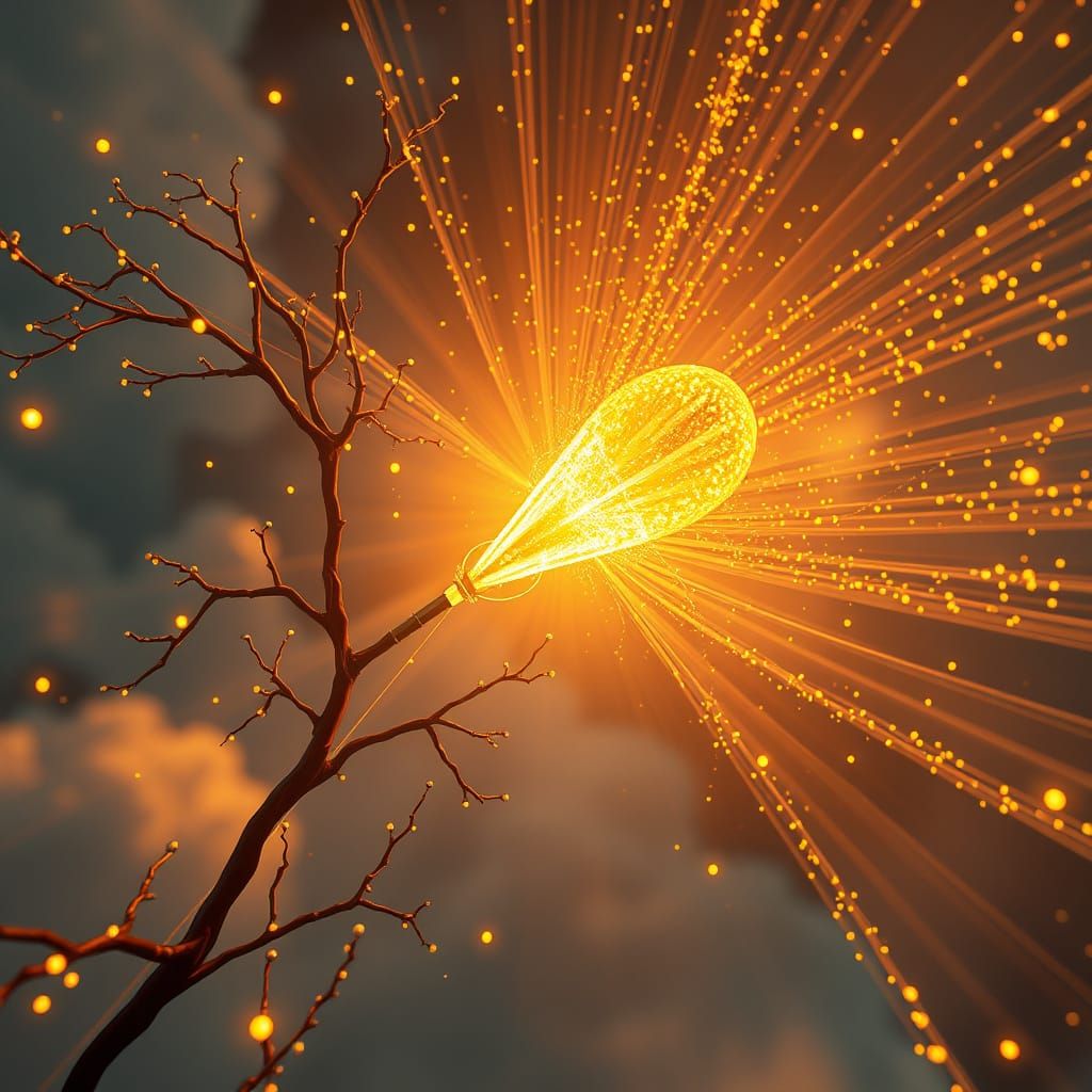 A surreal illustration of a vine of life glowing with golden filament, set against a cold and serene atmosphere. The scene is rendered in a 3D style with bold outlines and intricate details, blending realistic and fantastical elements.