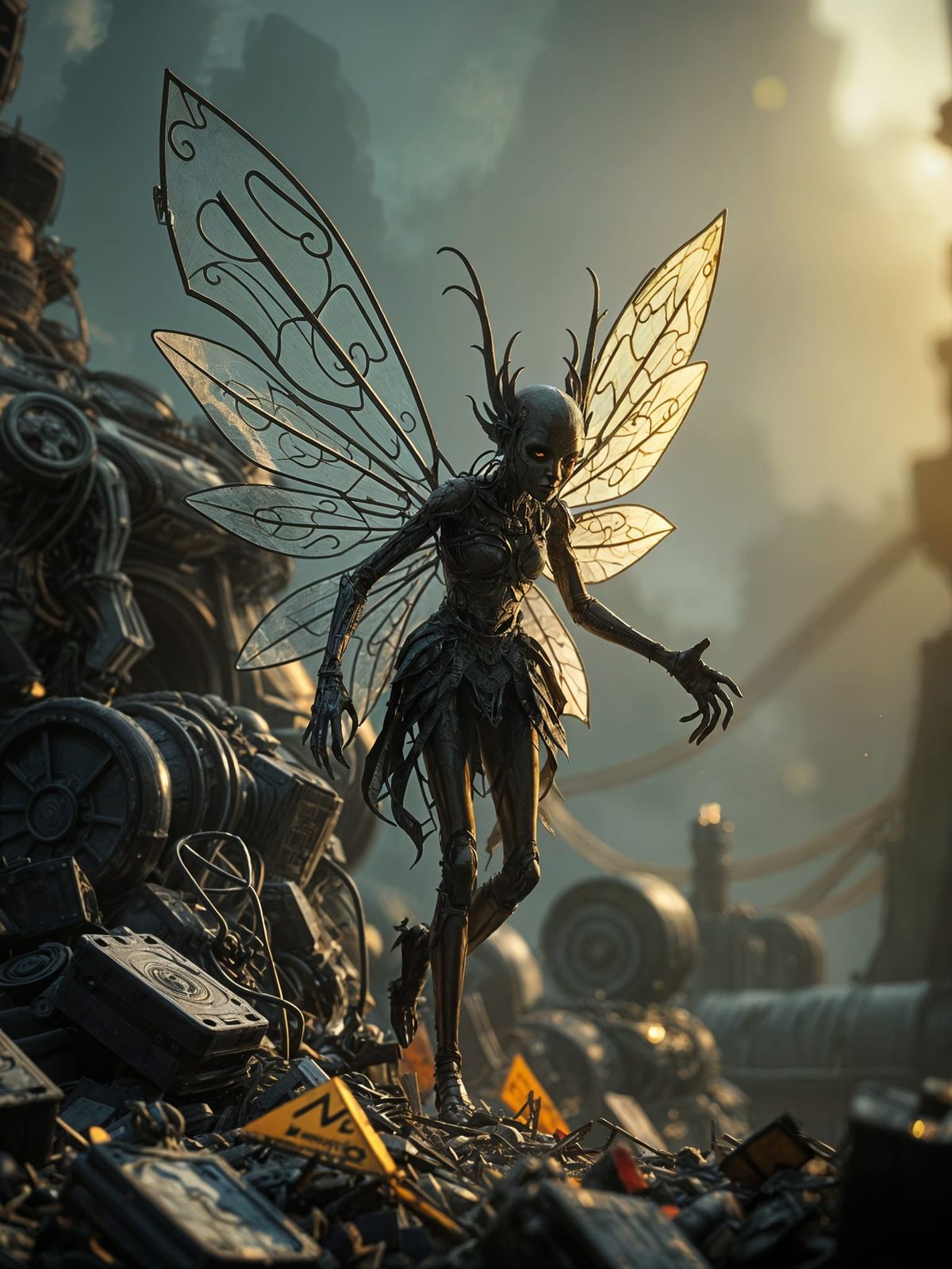 This image shows a fairy constructed from industrial waste, rendered with volumetric lighting. The scene is atmospheric and detailed, presented in a hyperrealistic style. The aesthetic is reminiscent of H.R. Giger's biomechanical art.