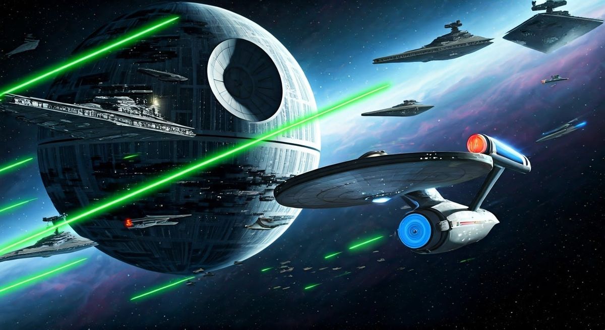 A cosmic clash of starships illuminates the heart of a vibrant nebula, with the Empire's Death Star facing off against a heroic trio of Starfleet vessels, their hulls aglow with ethereal light and energy