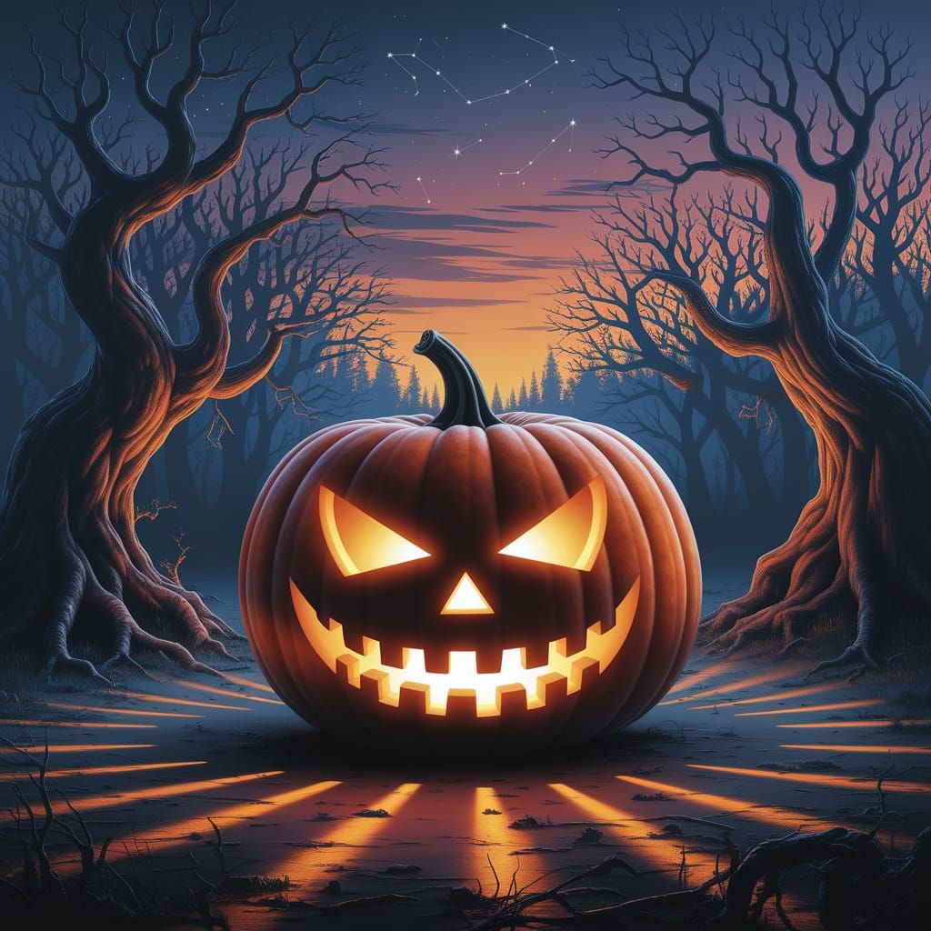 This digital art features a giant, carved pumpkin with a grotesque face, illuminated by torchlight in a dense, ancient forest. Warm amber light casts eerie shadows under a twilight sky, evoking an unsettling beauty.