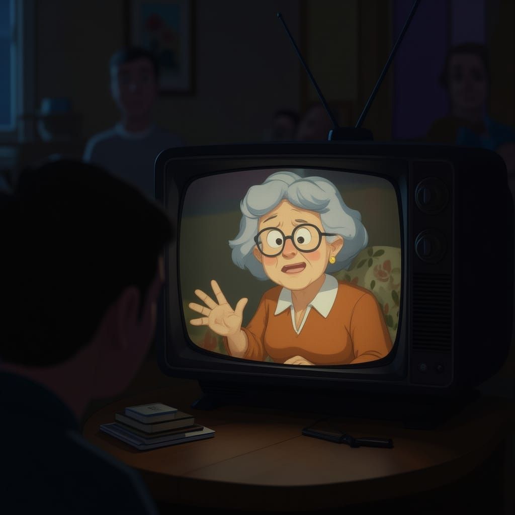 This image shows a cozy 1980s living room, featuring a floral sofa and glowing vintage TV. An elderly woman enjoys the warm lamplight, rendered in a soft 2D cartoon style with vibrant colors.