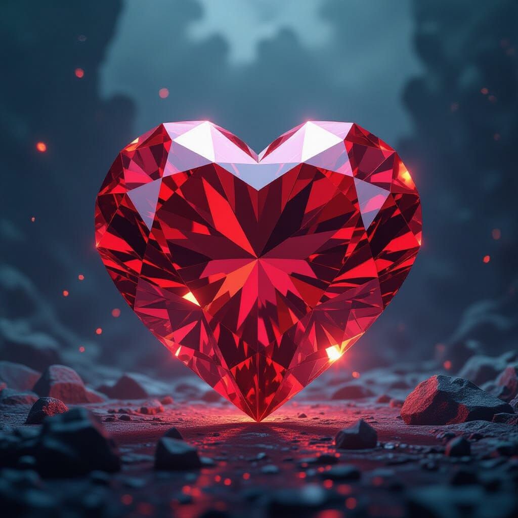 A striking picture of a colossal, ruby-red diamond heart shimmering against a dark, moody background. The image is highly detailed with a maximalist, digital matte painting aesthetic.