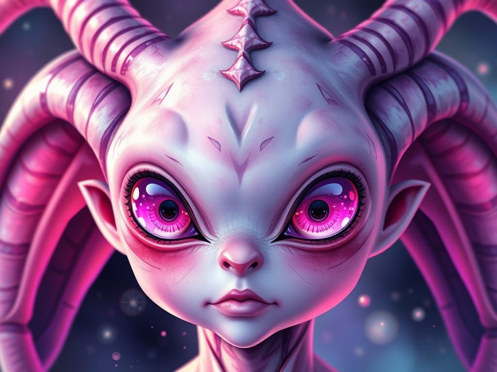 A digital illustration of a cute alien with pink and purple eyes and antennae. The image showcases a vibrant color palette and intricate details, rendered as colorful 3D art.
