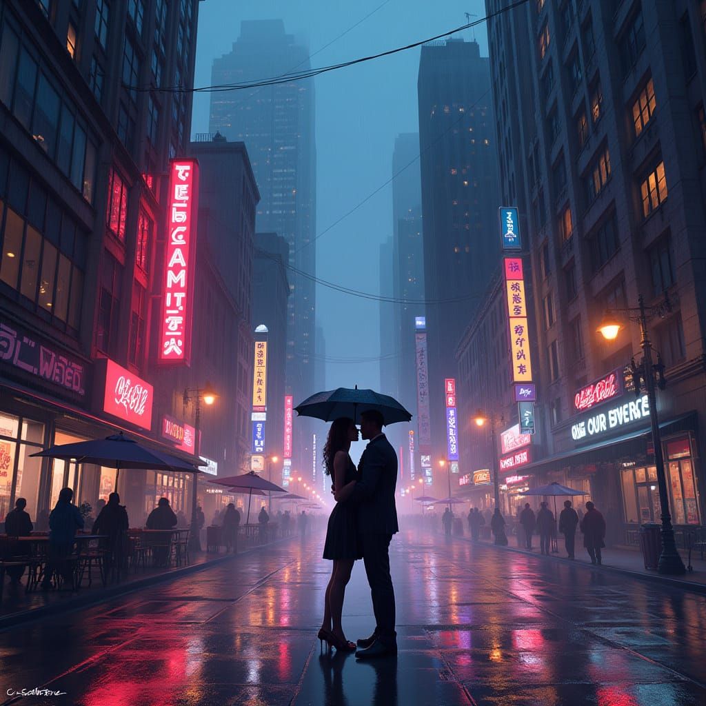 A vibrant image of a futuristic city street at dusk, featuring towering skyscrapers and couples kissing in the rain. The image is rendered with bold neon lights and atmospheric effects, in a cyberpunk aesthetic.