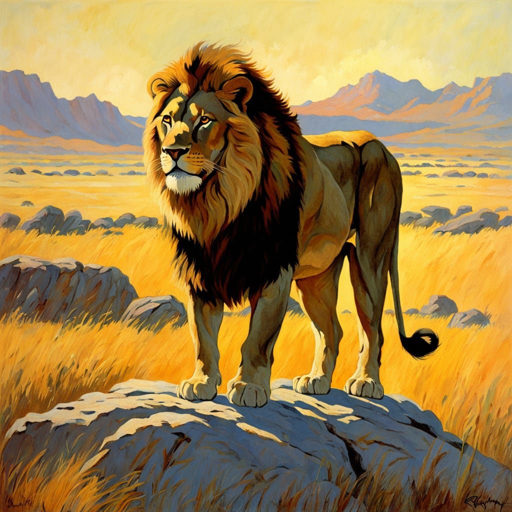 A striking picture of a lion standing on a rocky outcrop in the African savanna. Earthy tones and golden light capture the serene beauty of the scene, reminiscent of classic wildlife art.