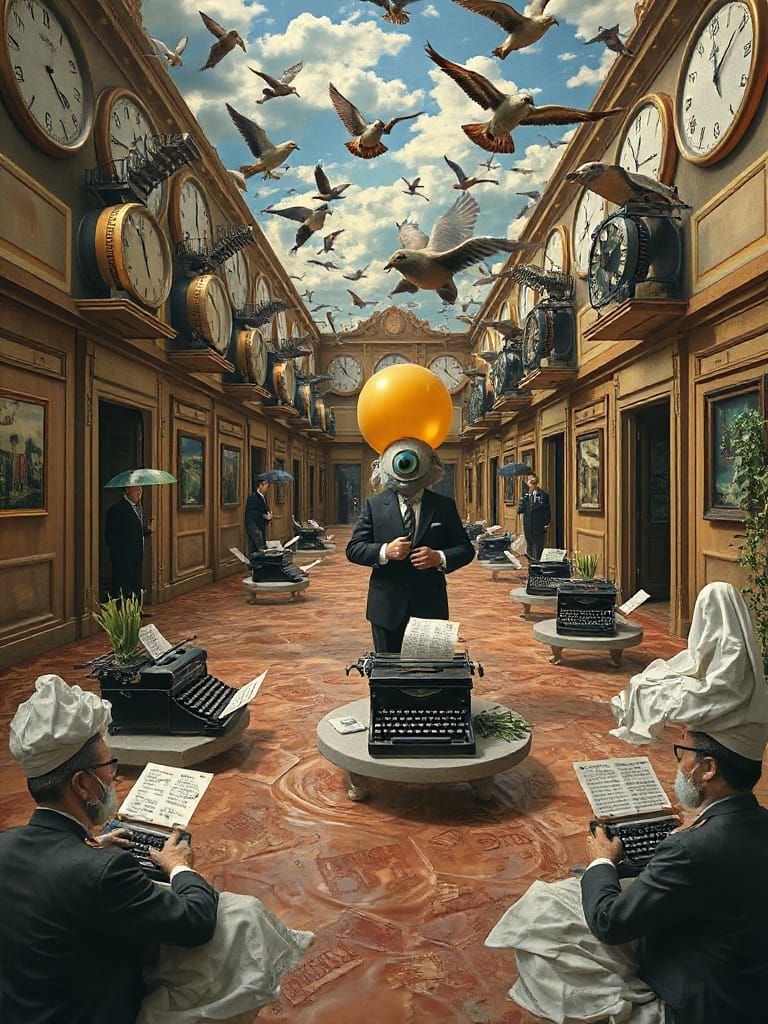 This hyperrealistic image depicts an absurd, immense hall blending bureaucracy and dreams. Melting clocks transform into birds, and a balloon-headed official stamps documents, creating miniature elephants. Strange figures and surreal elements fill the dreamlike scene.