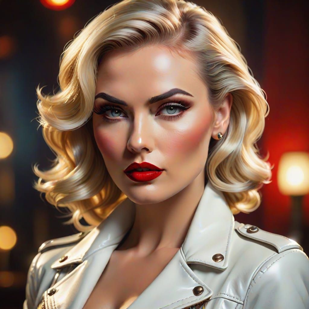 A captivating oil painting of a beautiful woman in a white leather jacket, with smoky eyes, bright gaze, and luscious red lips, set against a moody golden glow.