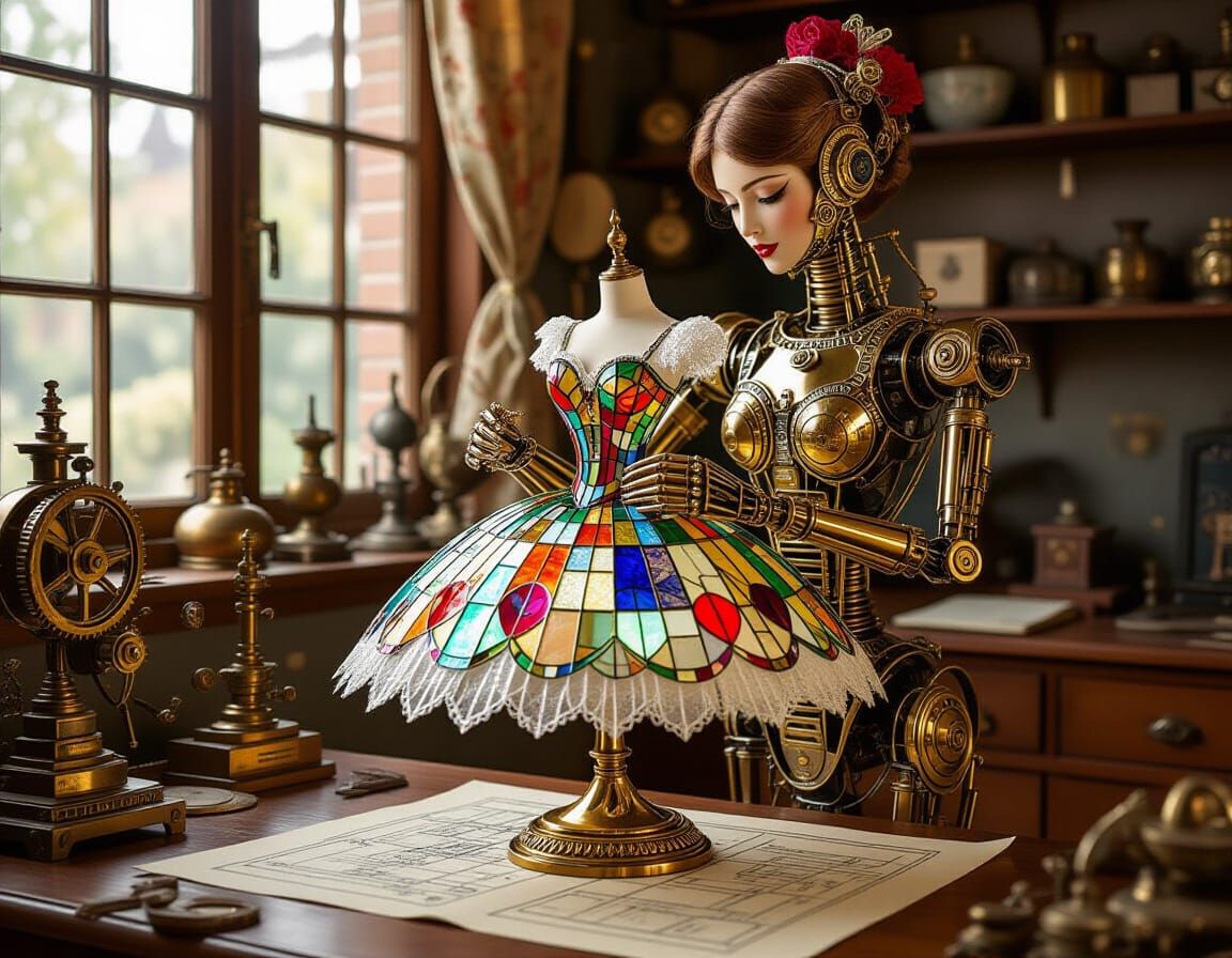 This detailed steampunk illustration depicts an automaton assembling a stained glass dress on a porcelain ballerina. Features polished metal and warm internal glows, evoking Victorian elegance.