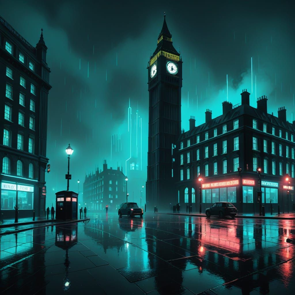 This image shows a digital rendering of a London street corner in a neo-noir aesthetic. The scene features Big Ben, deep fog, cyan neon signs, and wet reflections, rendered as digital art.