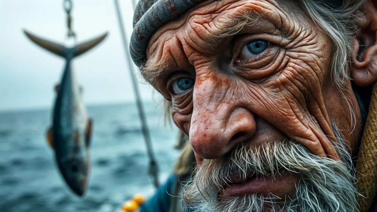 This image features an extreme close-up of a weathered, elderly fisherman on a boat. Bokeh and natural light highlight the sharp focus on his face, with a blurred fish in the background.