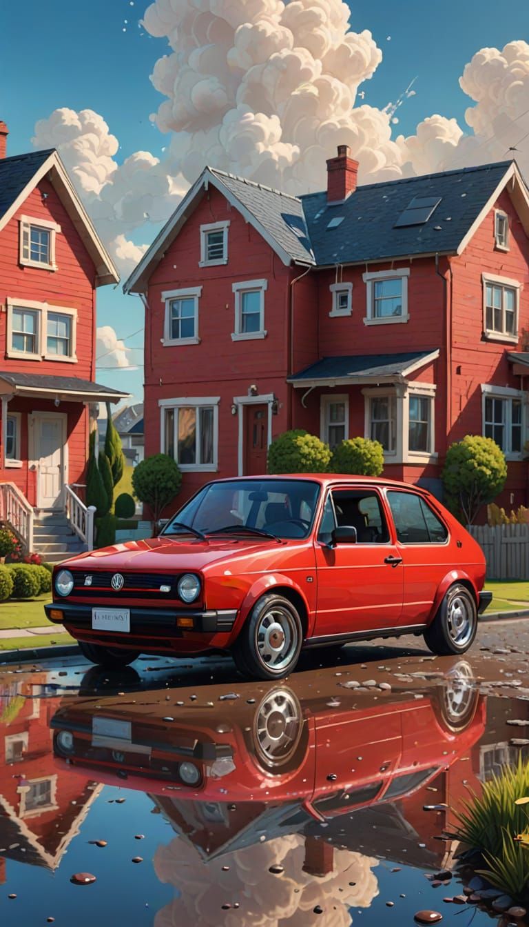 This image shows a dynamic cartoon-style illustration of a red Volkswagen GTI car, set against a bright blue sky with a brown house in the background, featuring bold and flat lighting, vibrant colors, and fun textures.