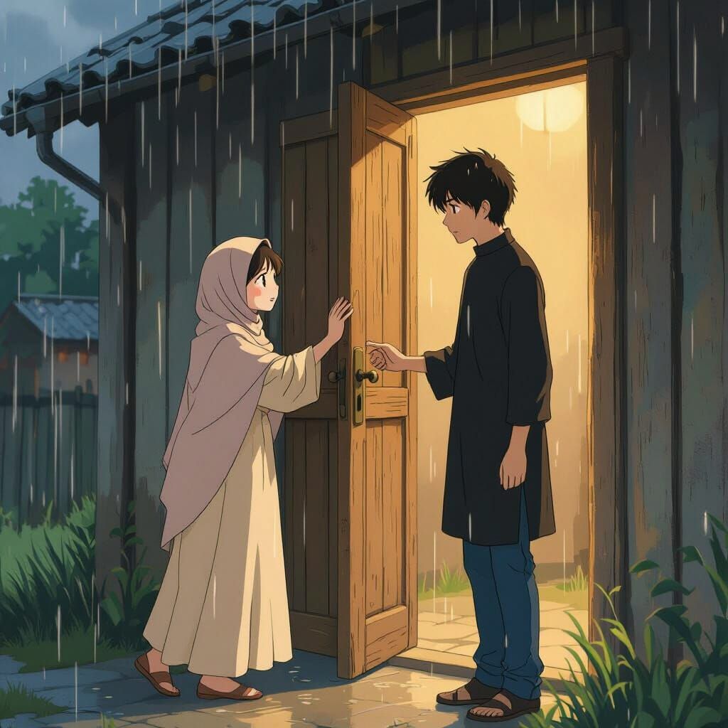 A girl in a hijab and dress urgently knocks on a rustic house door as rain falls. A young man answers, creating a scene with dramatic lighting and muted colors.