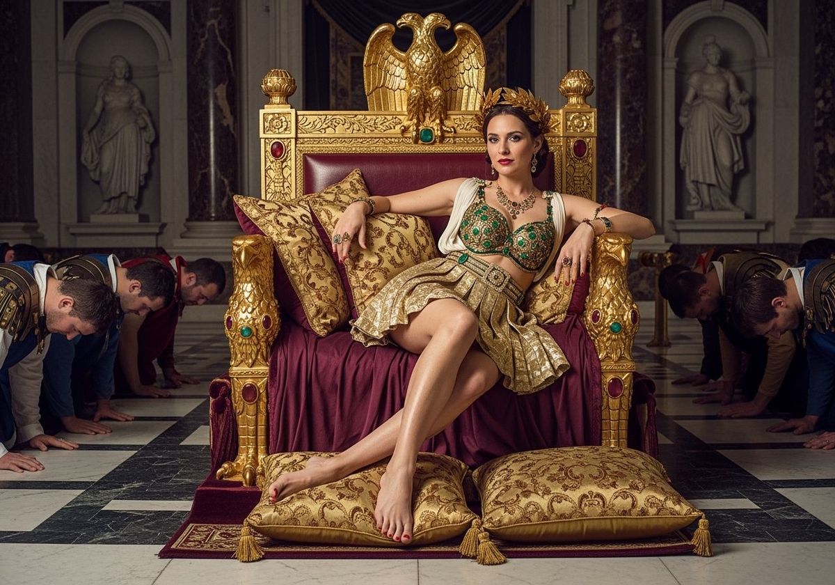 This image shows a Roman Empress seductively lounging on her throne. She is surrounded by bowing peasants in a lavish palace with marble floors and columns. The scene is rendered with sharp focus and natural lighting.