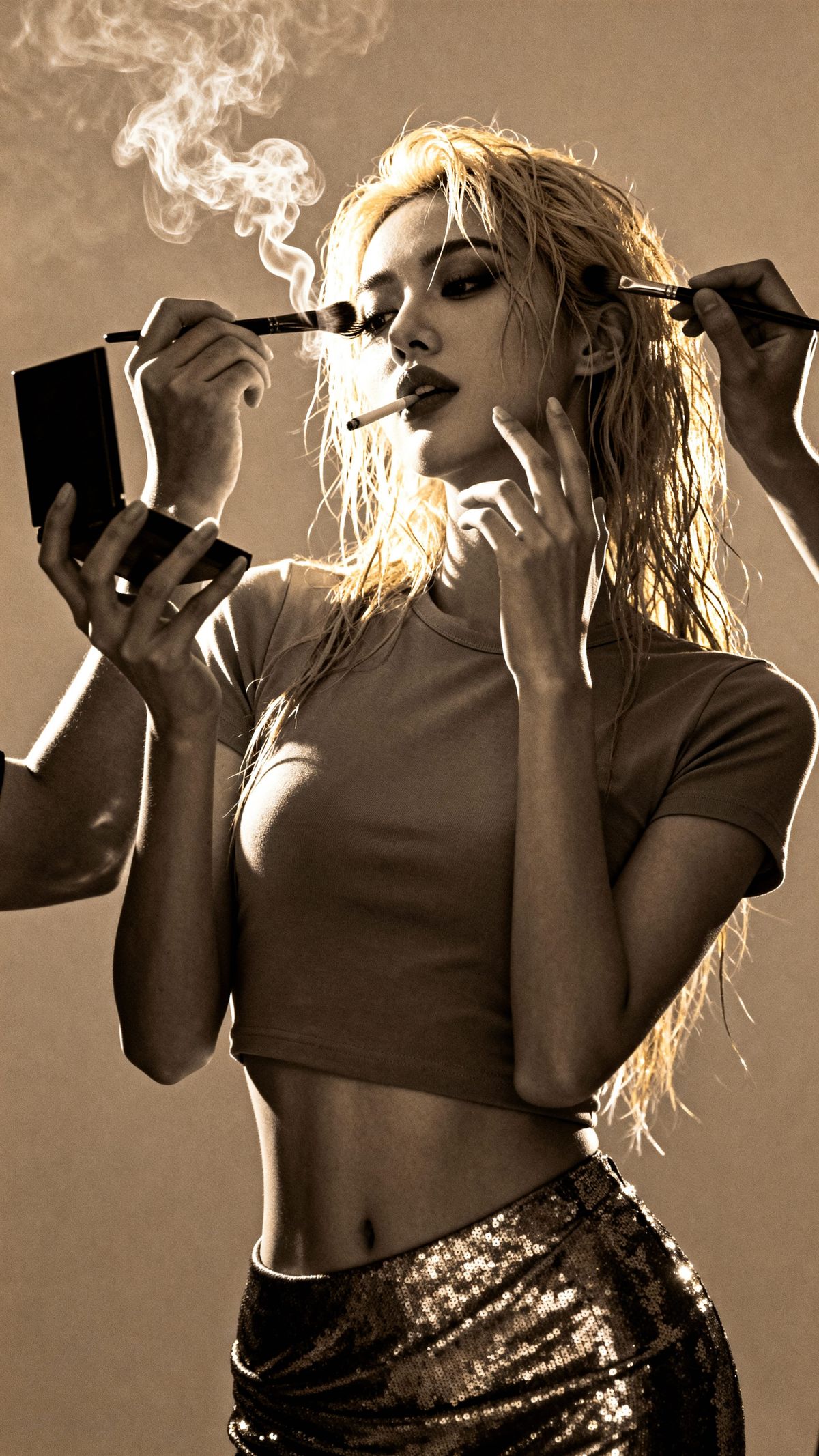 This image shows a confident woman with blonde hair, wearing a crop top and skirt. She is applying makeup with a brush and holding a compact mirror, with smoke from a cigarette creating a hazy effect.