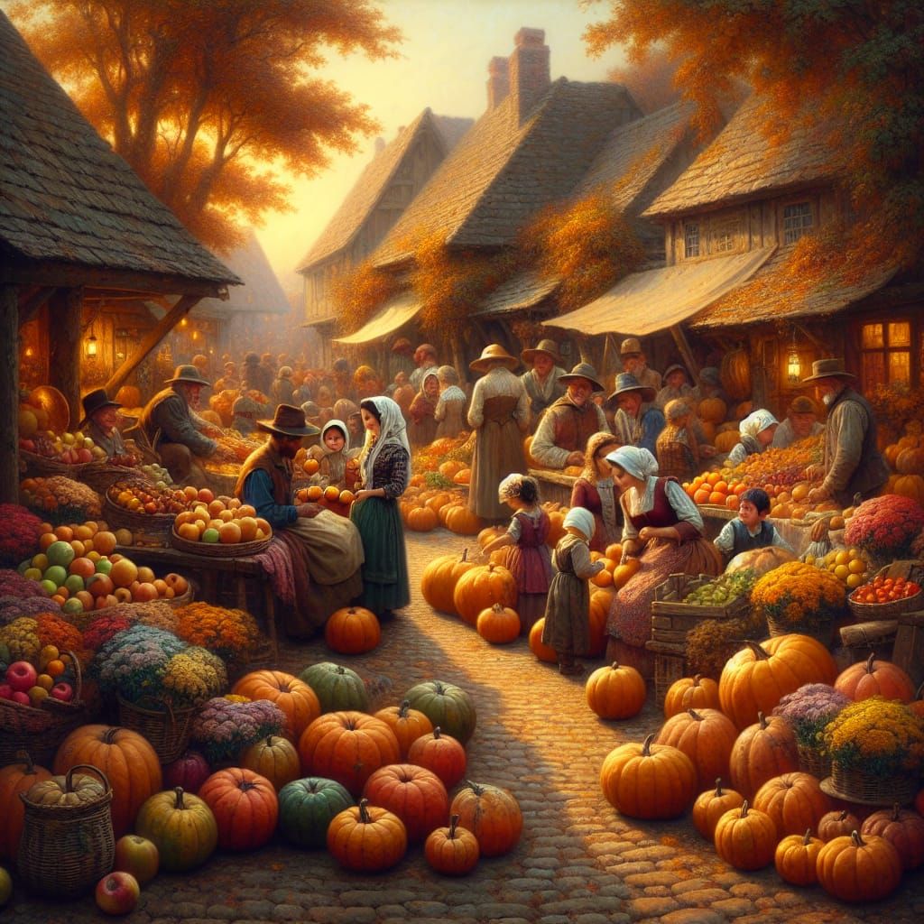 This image depicts a charming rustic autumn market overflowing with pumpkins, apples, and flowers, illuminated by soft golden hour light. Villagers enjoy the scene with detailed textures and a painterly impressionist style.