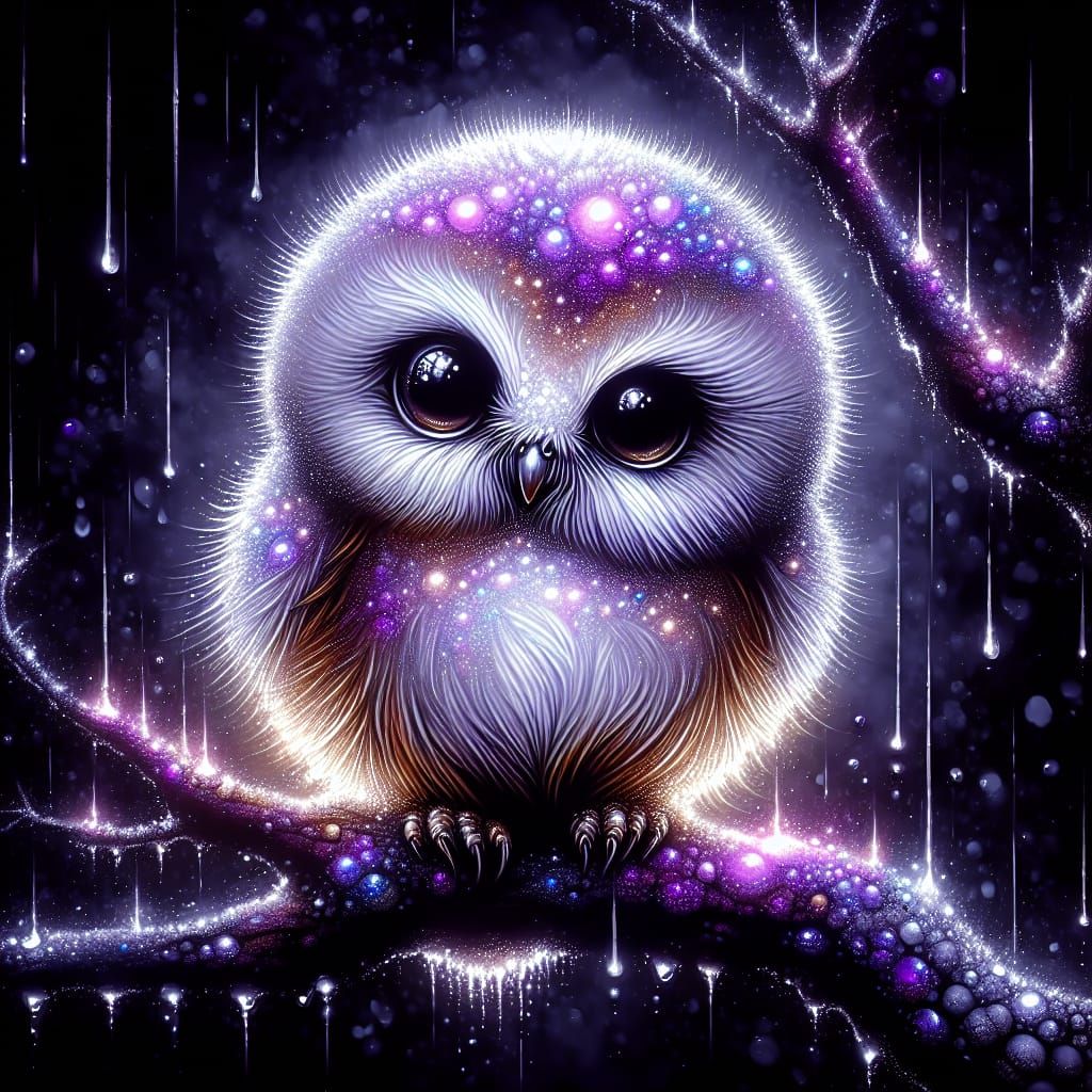 A captivating image of a small, fluffy owl with radiant purple and silver feathers. The owl sits on a branch during a heavy rain at night, rendered with a luminous alcohol ink technique and magical realism.