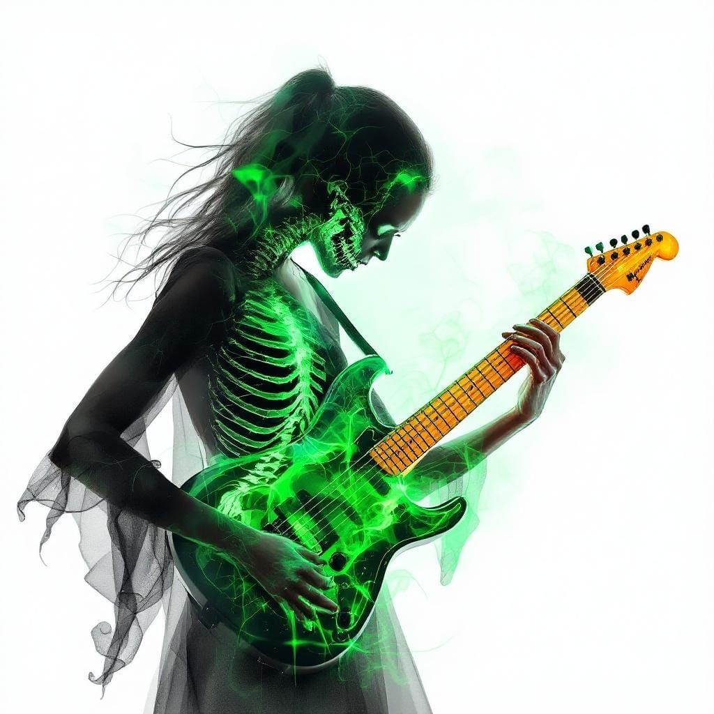 This image shows a guitar silhouette filled with a glowing bone sanctuary. A ghostly woman made of smoke plays, blending into the background in a glitch art aesthetic with electric crackling effects.