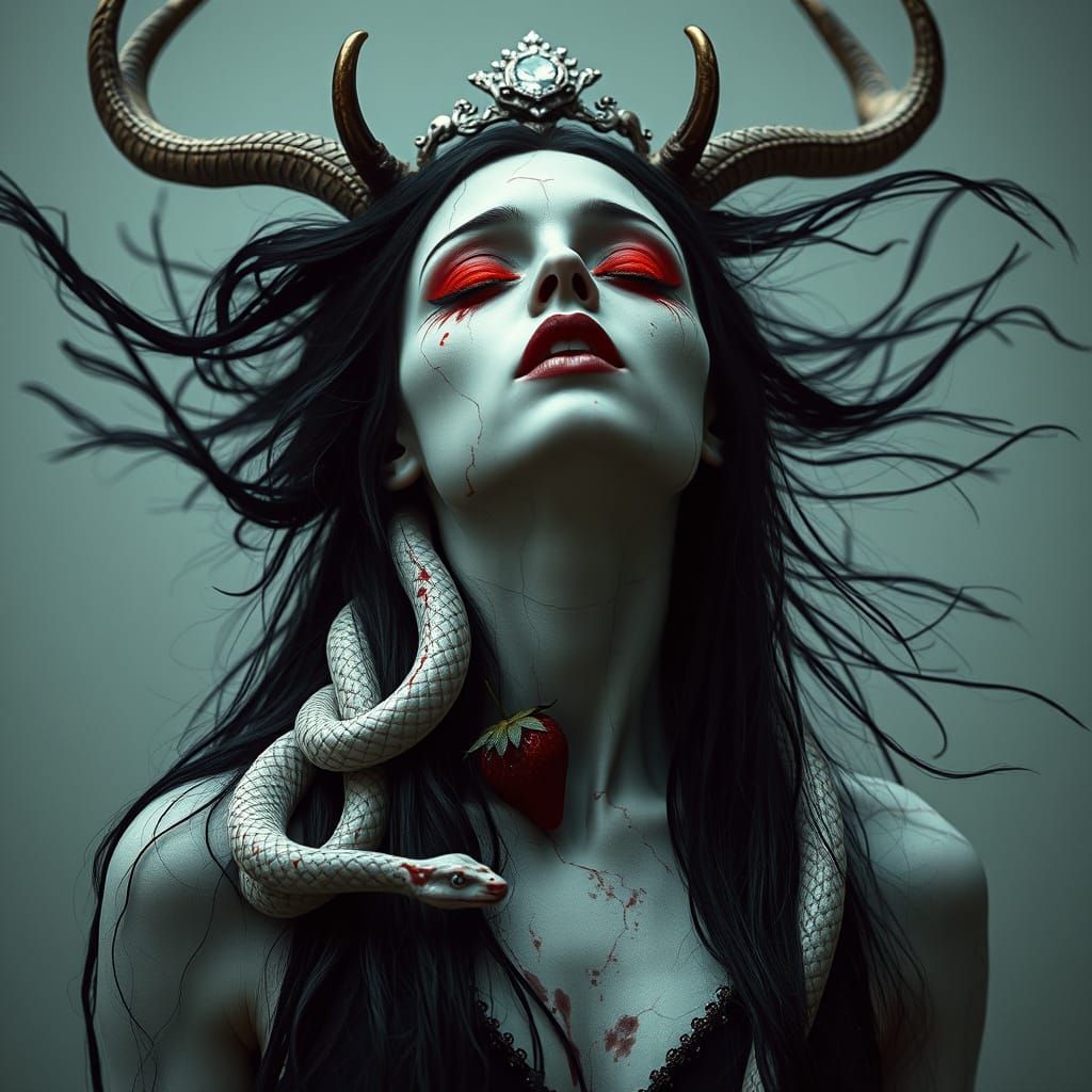 A striking picture of a gothic queen with deer horns and snakes. Wires and scars mark her cracked skin in this cinematic scene with a dark, moody aesthetic.