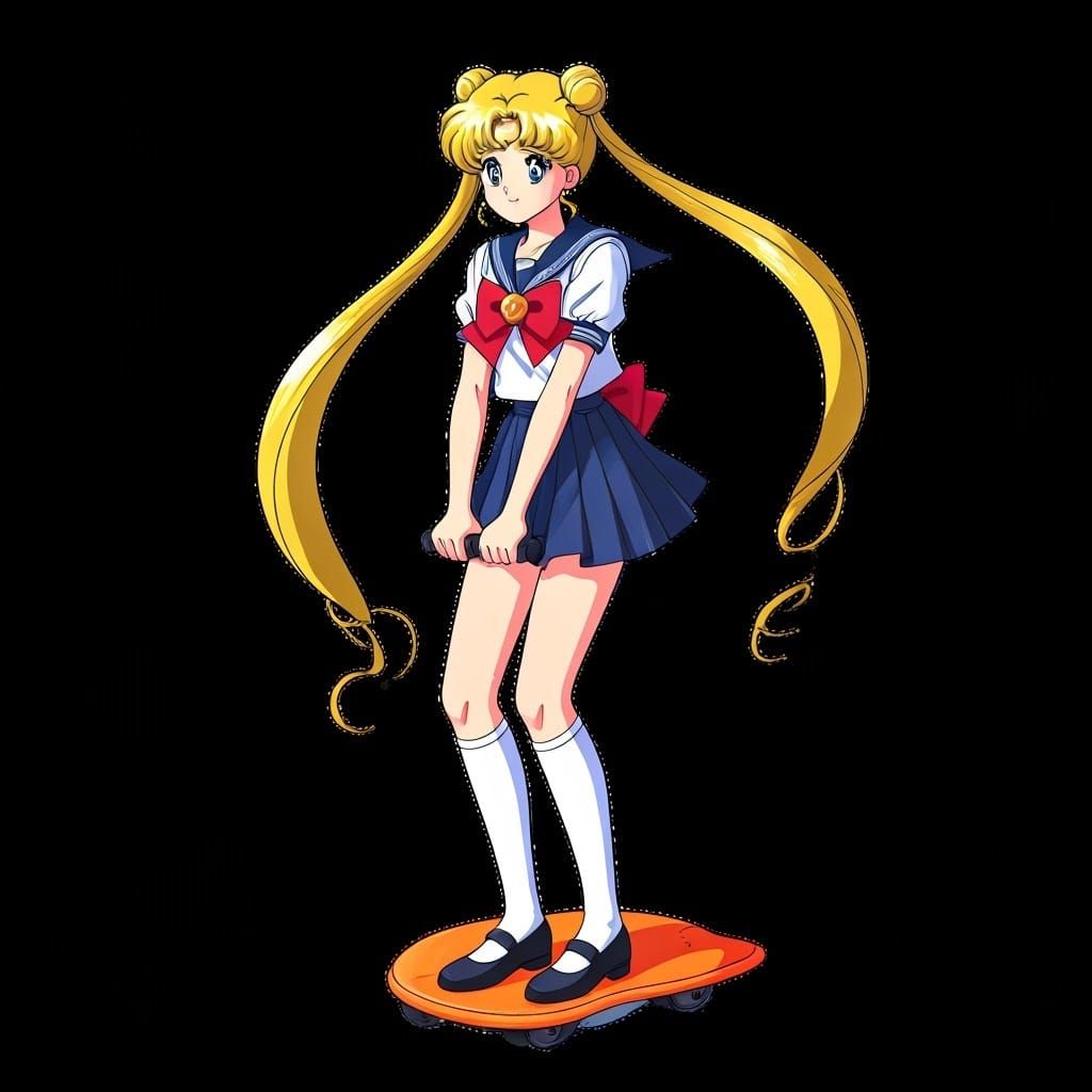 This image shows Minako Aino in a school uniform bouncing on an orange space hopper. The artwork evokes the style of 90s anime, reminiscent of a screencap from Sailor Moon.