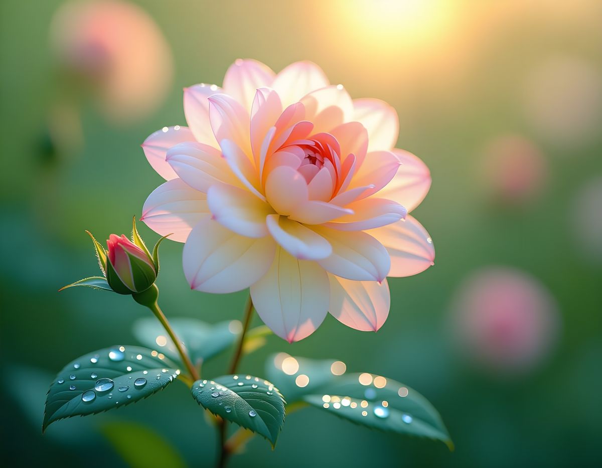 A detailed pastel drawing of a rose at sunset with raindrops on its petals in a beautiful garden. This image captures a romantic aesthetic with ultra-detailed filigree and highlights.