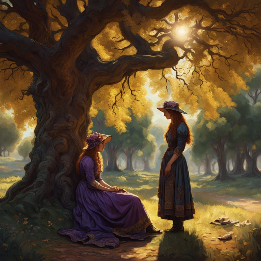 This oil painting depicts young women conversing beneath an oak tree, with sunlight filtering through the leaves. It features meticulous detail, rich colors, and dramatic chiaroscuro lighting in a Pre-Raphaelite style.