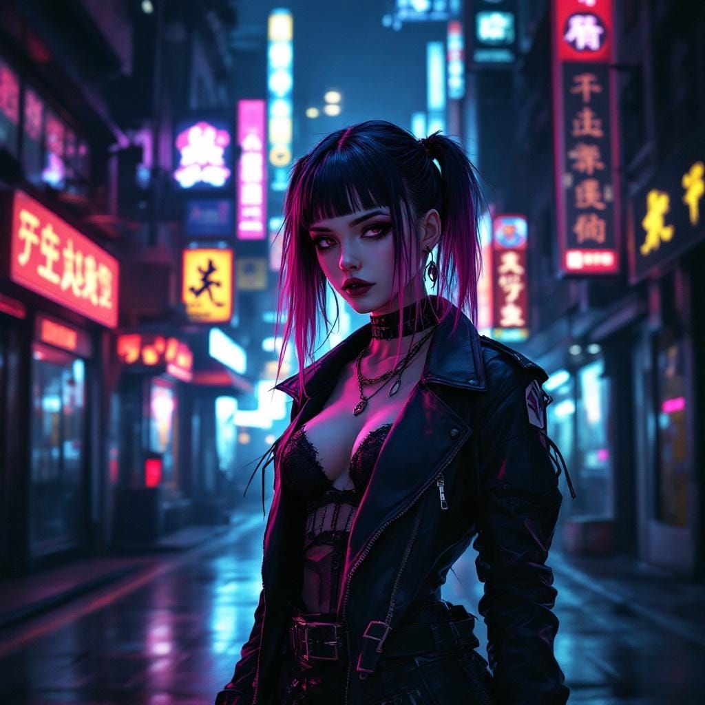 This image shows a goth woman with striking half-black, half-pink hair in a neon-lit futuristic city alley. Rendered in a detailed digital art style with dramatic lighting.