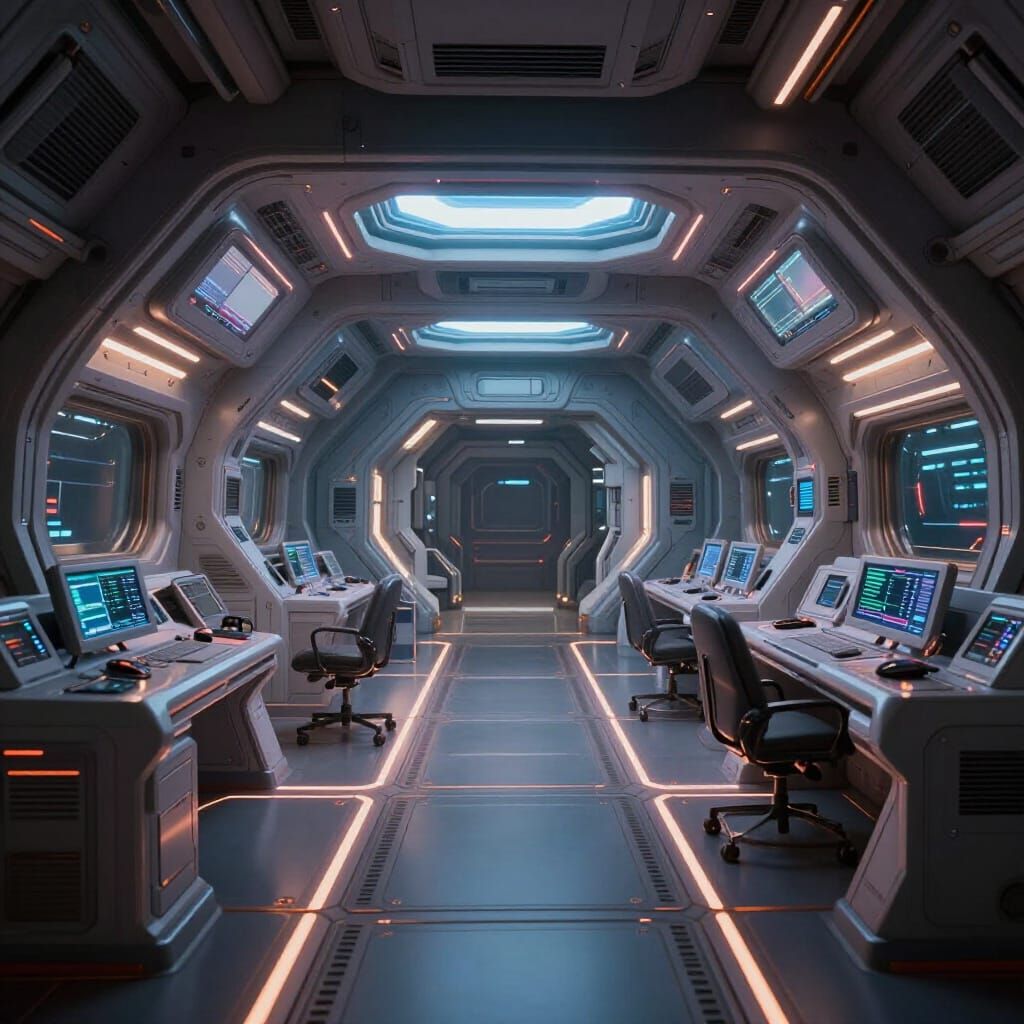 This image shows the detailed interior of an advanced spacecraft, featuring dynamic lighting and an epic 3D videogame cinematic feel, rendered in high resolution.