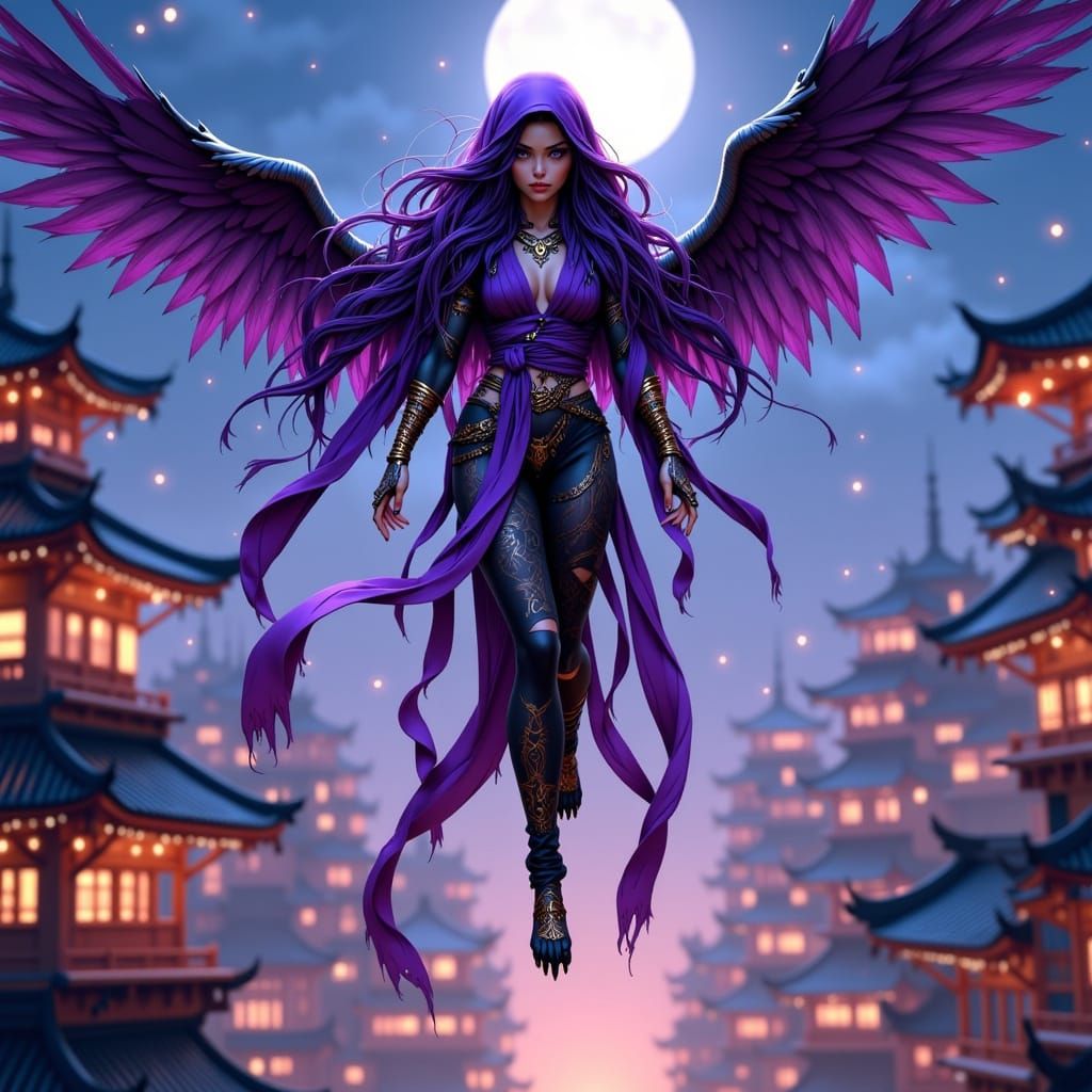 A highly detailed, 8k resolution concept art portrait of a hooded, exotic warrior princess flying above neon pagodas. She wears silk scarves and features metallic tattoos.