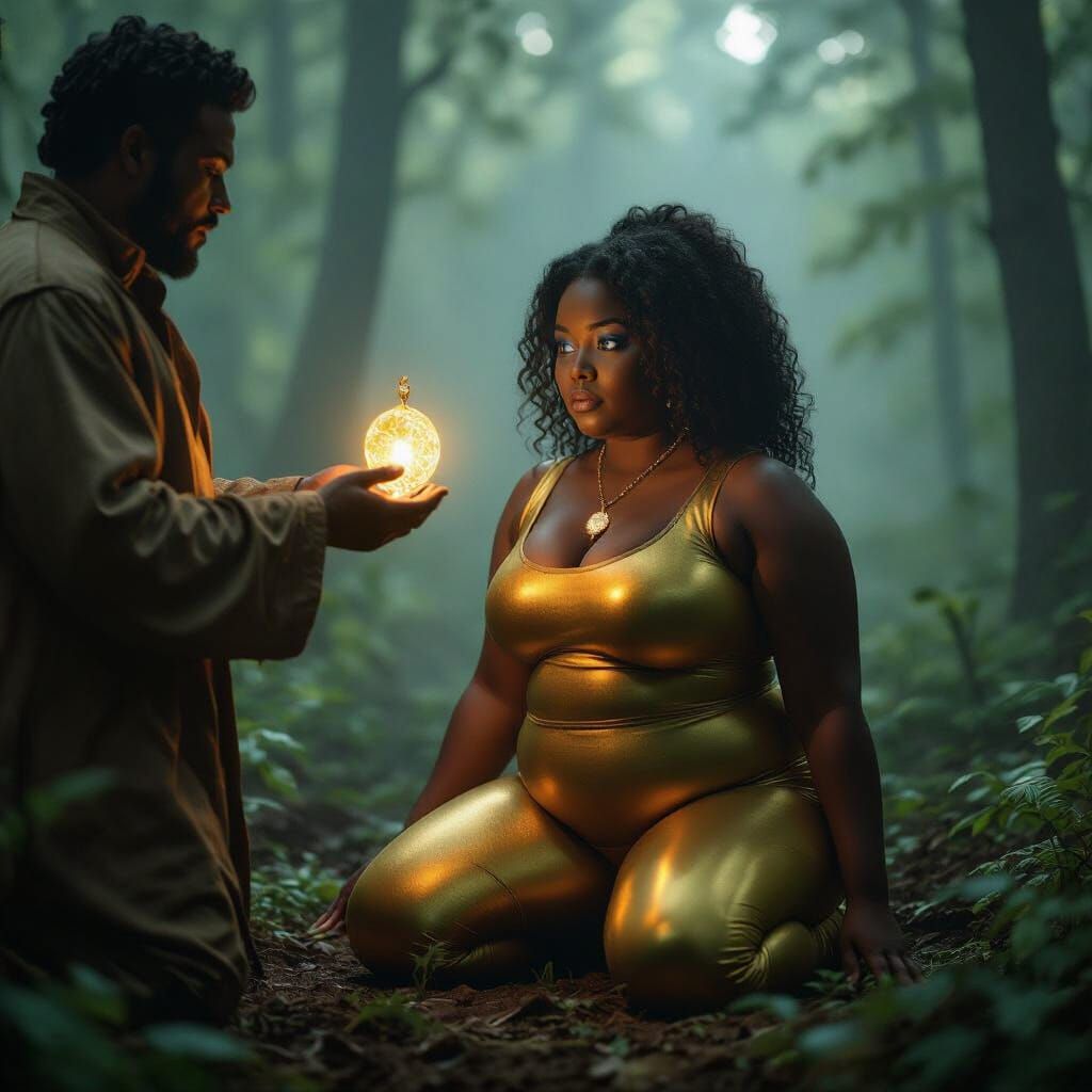 This image shows a girl kneeling in a forest, mesmerized by a man holding a pendant. The cinematic lighting and film grain create a dramatic, atmospheric scene reminiscent of 35mm film.