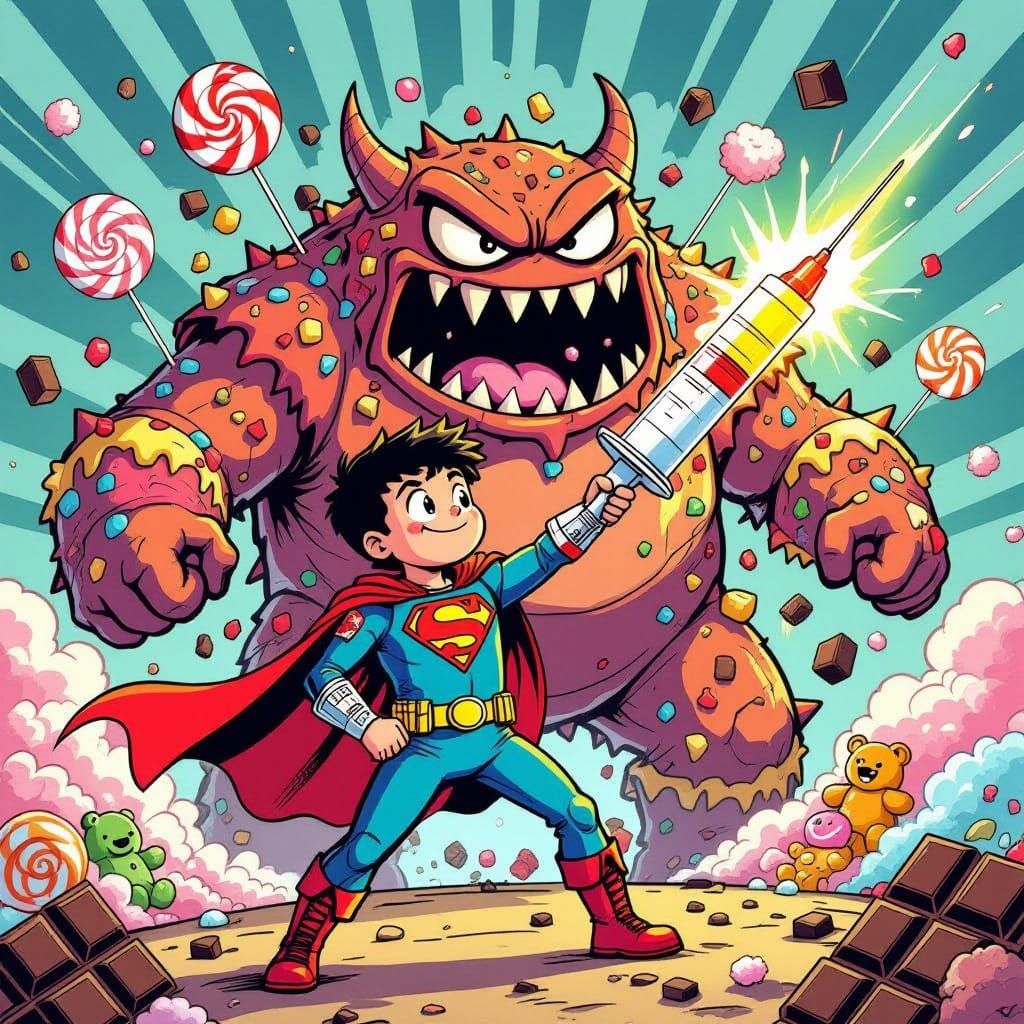 This image shows a young boy in a colorful superhero costume battling a giant monster made of sweets, with a bold insulin syringe as his trusty weapon, in a dynamic comic-book-inspired scene with bold lines and bright colors.