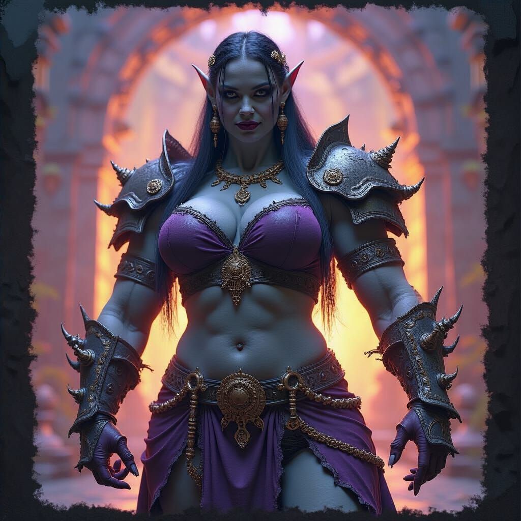 This image shows a muscular drow mother in dark fantasy armor, standing heroically. The shot features cinematic lighting, film grain, and a vignette, with purple and yellow hues in a fantasy art style.