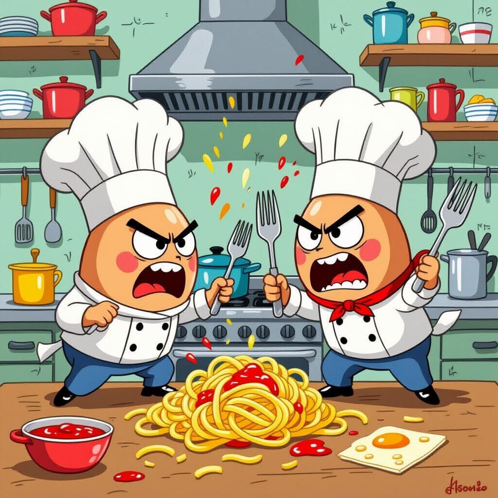 This image shows a whimsical food fight in a kitchen, with angry eggs in chef hats battling pasta. The scene features vibrant colors and playful textures, creating a chaotic and humorous visual.