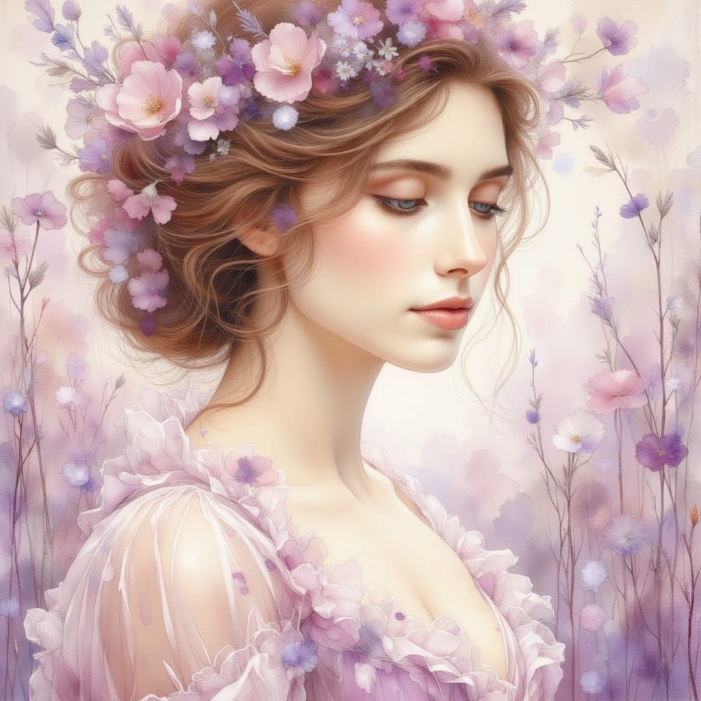 This AI-generated image features a woman with classic features and a dreamy expression, rendered with blurred watercolor textures and soft focus in a palette of mauve, lavender, and blush.