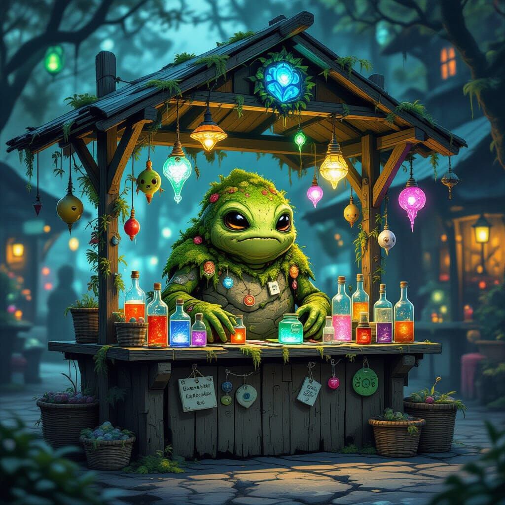 Highly creative. An alien market stall run by a sentient, moss-covered rock creature, selling bottled emotions and memories from distant galaxies. Dark fantasy art, whimsical. The stall is adorned with bioluminescent fungi and dangling alien charms. Moody lighting, intricate details, oil painting style, ...