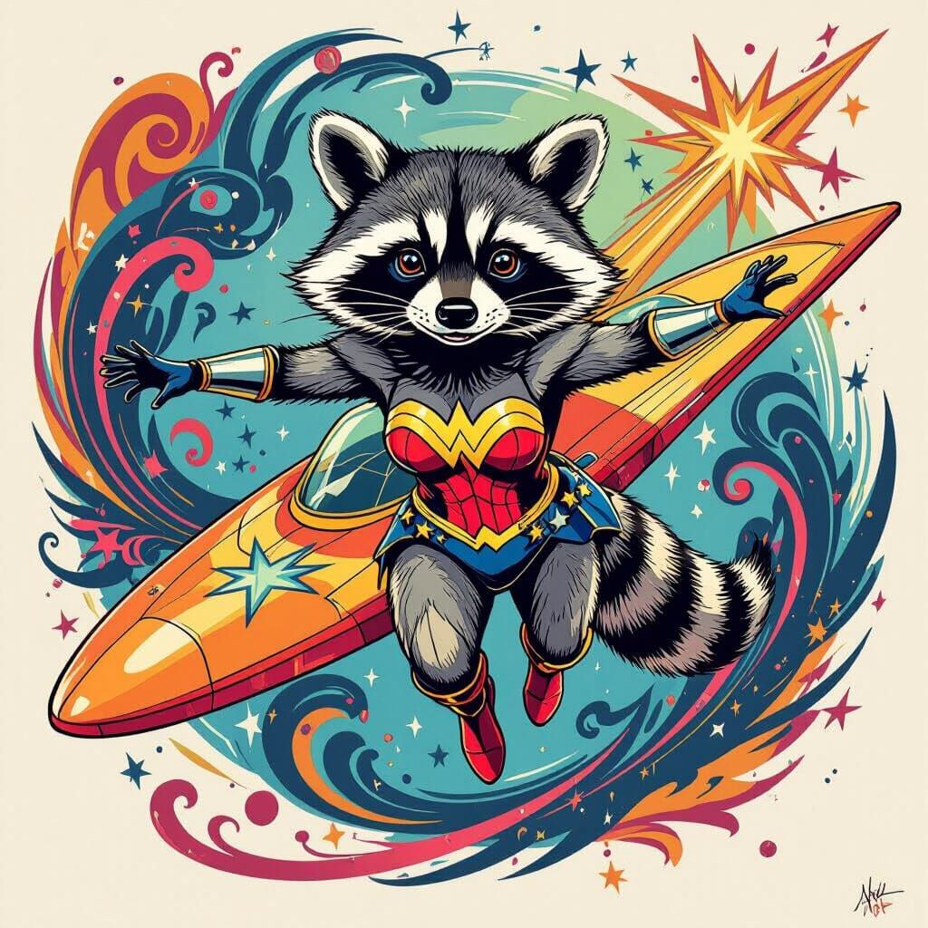 A vibrant image of a raccoon dressed as Wonder Woman piloting an invisible plane. The artwork features ink-style swirls and pop art colors, creating a bold and dynamic scene.
