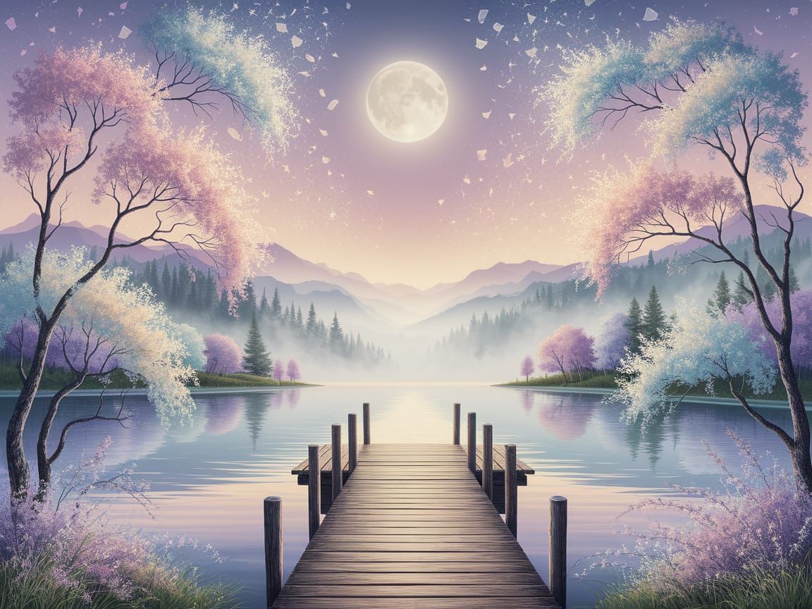 This image shows a serene nighttime landscape with a wooden dock on a calm lake under a pastel sky with a full moon. It is rendered in a soft, painterly fantasy realism style.