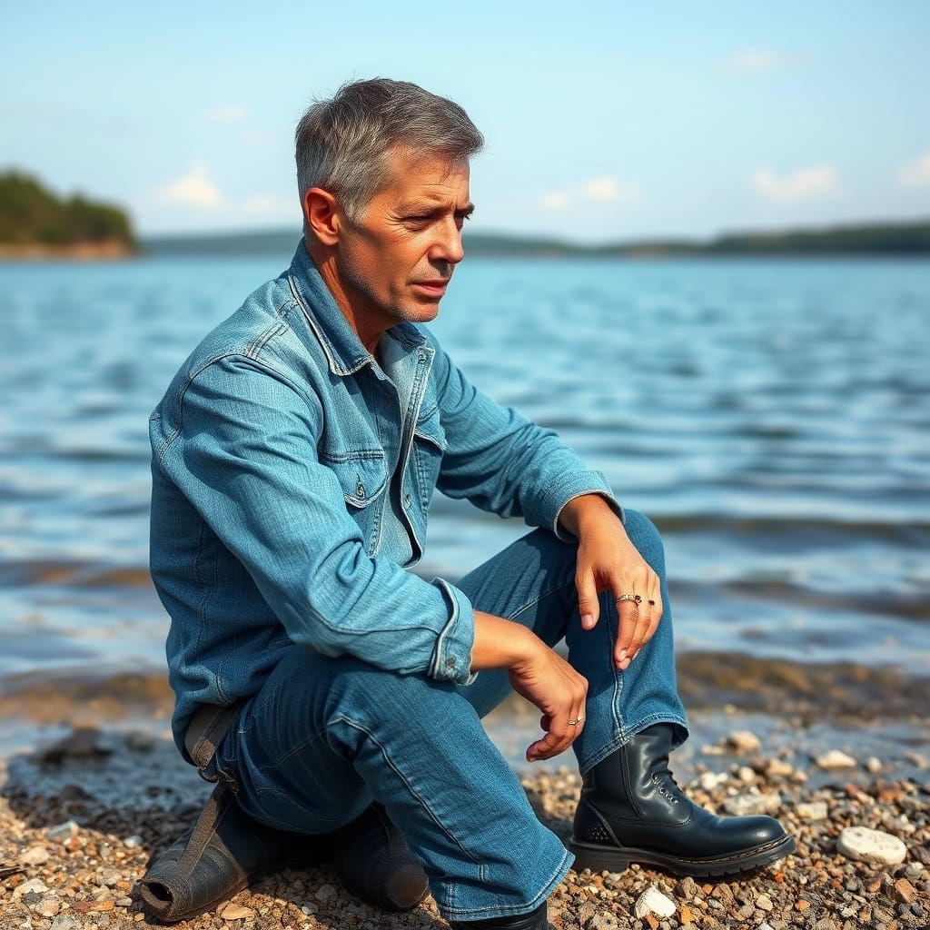 This image shows a lone figure sitting by a peaceful lake, dressed in worn denim and black boots, reflecting on a long and difficult journey ahead.