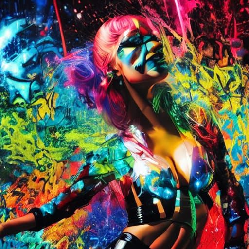 This image shows a DJ performing in a crowded nightclub. The scene features graffiti-style art, neon lighting, and dynamic strobe effects, rendered with high contrast and polychromatic colors in a digital art style.
