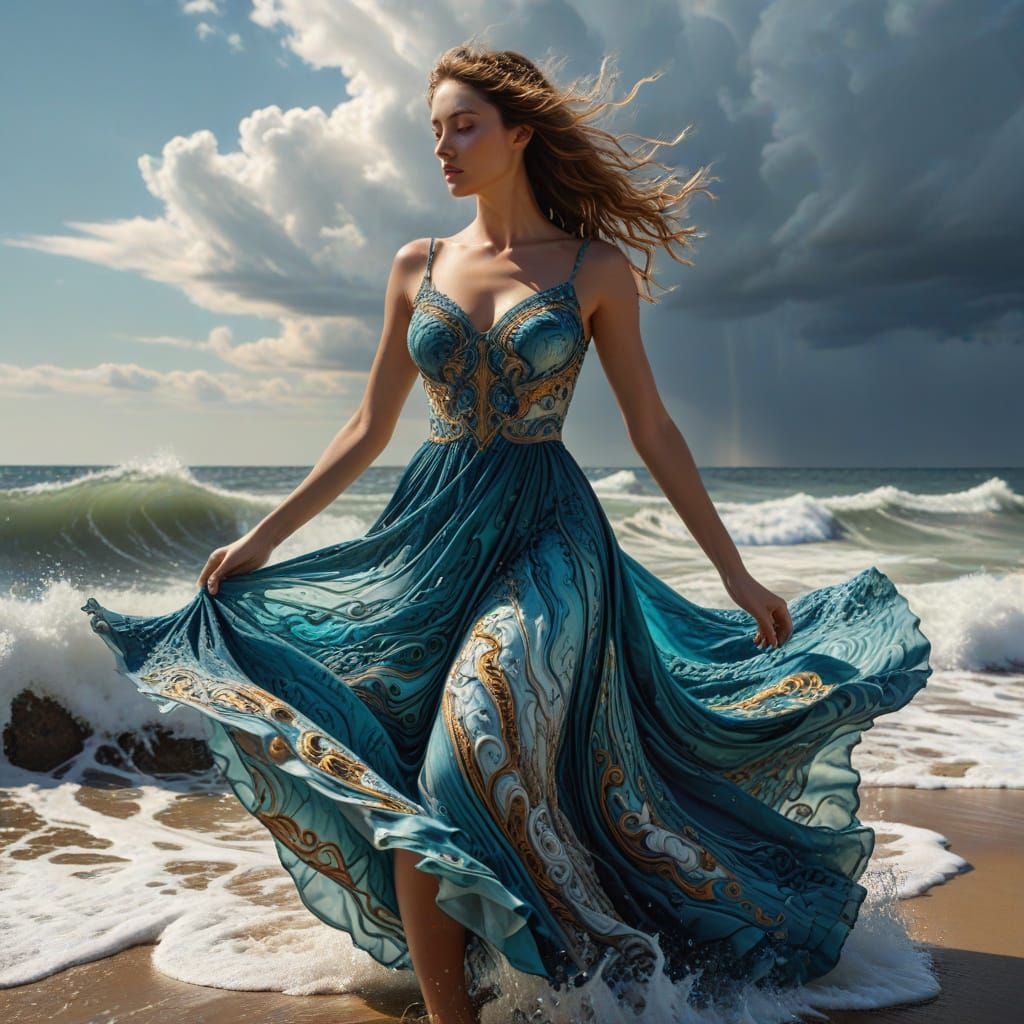 A striking picture of a surreal goddess in an elegant blue dress made of ocean water. This detailed matte painting captures a dreamlike scene with complementary colors and intricate details, reminiscent of melting oil on canvas and late afternoon seaside fractals.