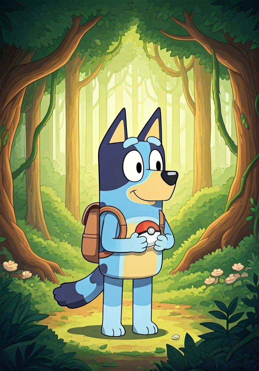 This image shows Bluey, the cartoon dog, in a vibrant forest. She is smiling, wearing a backpack, and holding a pokeball containing a Squirtle, rendered with whimsical colors and lively textures.