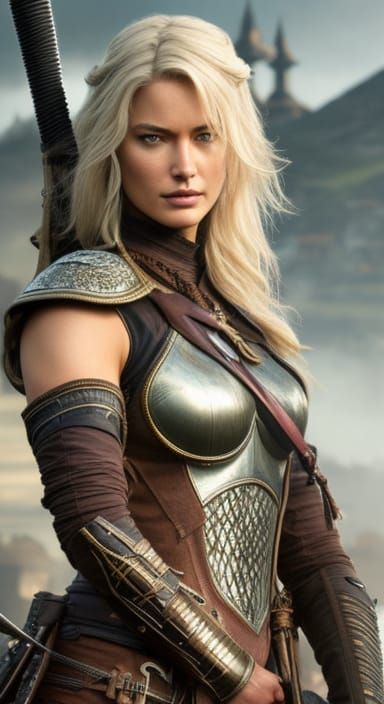 This image shows a stunning depiction of Ciri in iron and leather armor. The digital illustration features realistic details, wavy blonde hair and brown eyes, rendered with natural lighting and a shallow depth of field.