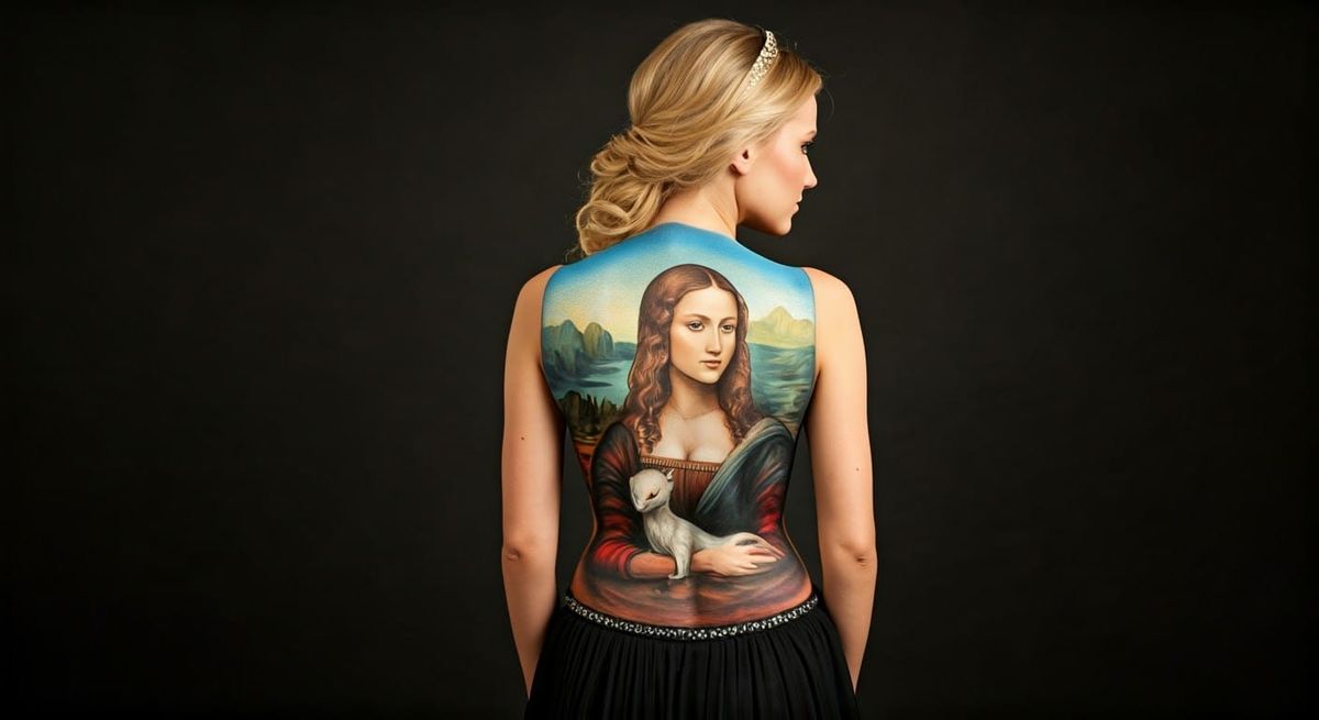 This image shows a stunning recreation of a famous painting in a unique medium, with a young woman's back adorned with a vibrant body art rendition of Leonardo da Vinci's 'Lady with an Ermine'