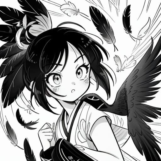 This image shows a close-up of a teenager girl with feathers and a beak in a manga style. The anime-inspired drawing has a cityscape background, high contrast lighting and bold colors.