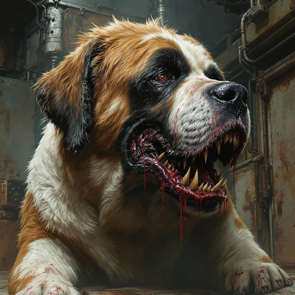 This image shows a massive, biomechanical dog with matted fur and gruesome teeth, set against a dark, industrial backdrop of rusted machinery and exposed wiring, with intricate mechanical details and a sense of foreboding