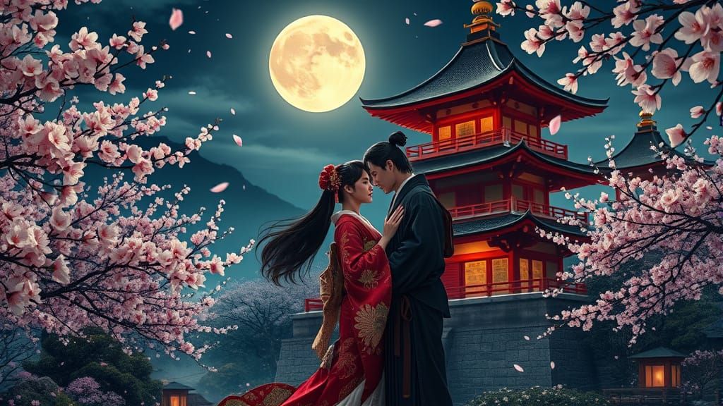 This image shows a samurai and geisha in a romantic embrace beneath the moonlit sky. Cherry blossoms surround them in a peaceful Japanese garden, captured with cinematic lighting and a dreamy atmosphere in an art nouveau style.