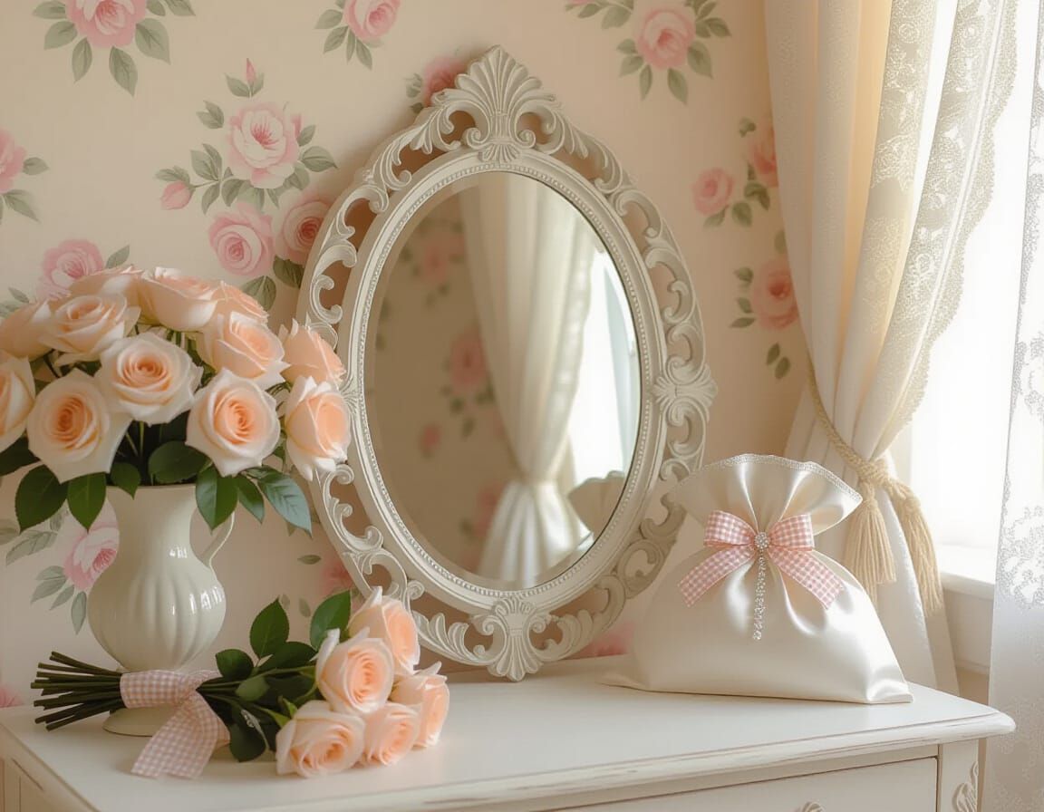 A still life featuring a vintage oval mirror with baroque carvings set against floral wallpaper. Soft pastel peach roses and sheer lace curtains add to the shabby chic aesthetic, with soft, ethereal light.