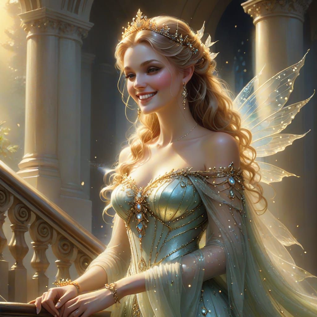 A medium shot of a fairy queen smiling as she descends a staircase. This fantasy art piece uses warm golden lighting and volumetric mist to create an ethereal, magical scene.