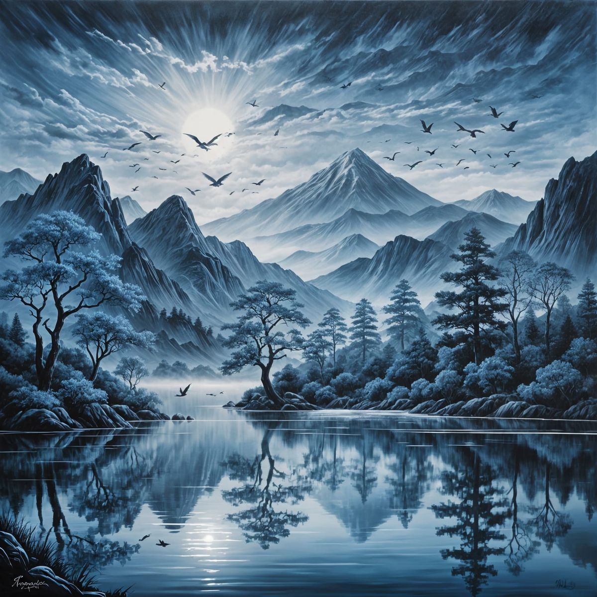 A moonlit peak, reflections clear, Majestic trees, the night draws near. Birds take flight in twilight's grace, A tranquil, blue-hued mountain space.